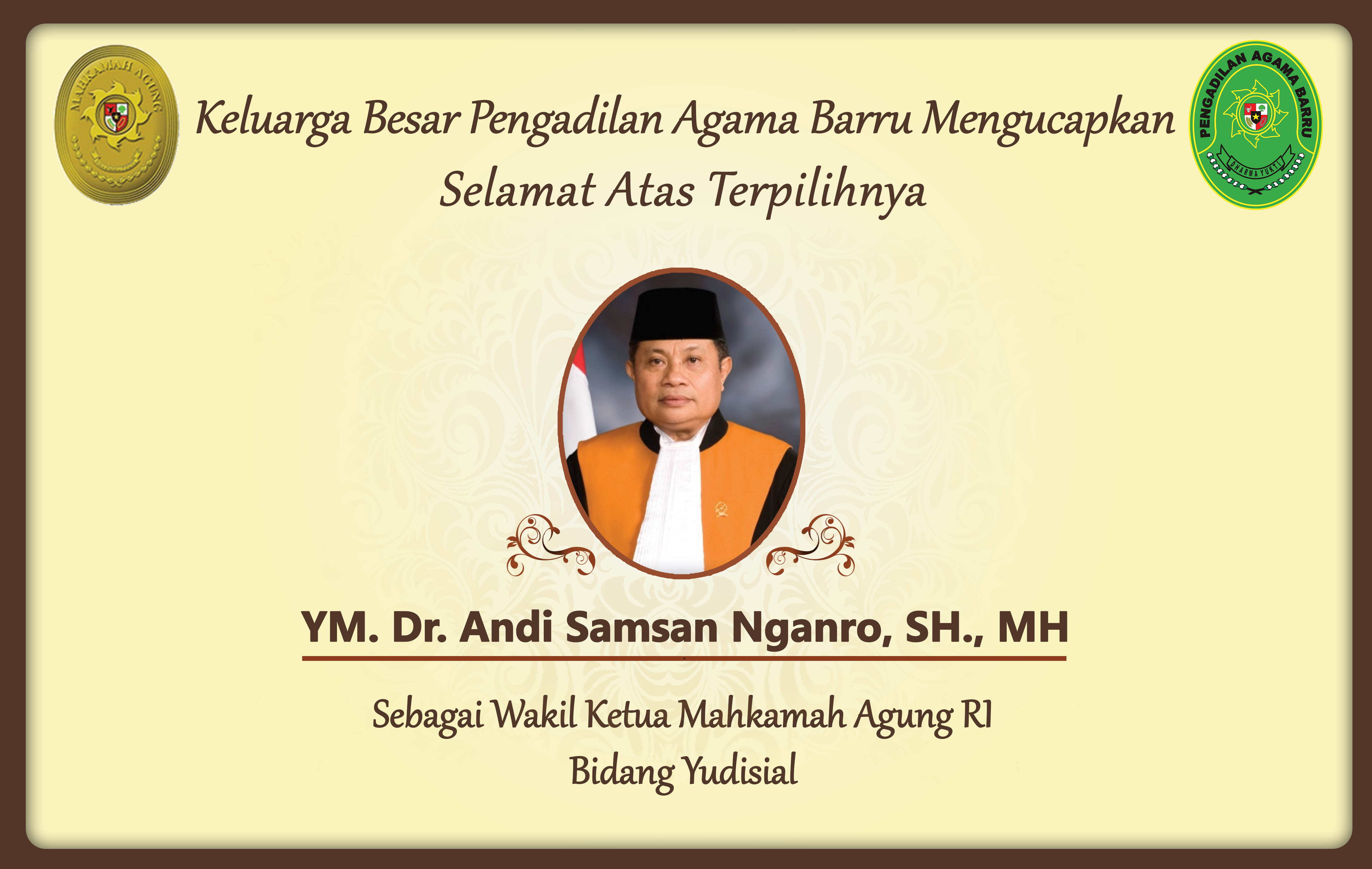 Keluarga Besar Pengadilan Agama Barru, mengucapkan selamat & sukses atas terpilihnya YM. Dr. Andi Samsan Nganro, SH., MH. sebagai Wakil Ketua Mahkamah Agung RI Bidang Yudisial.