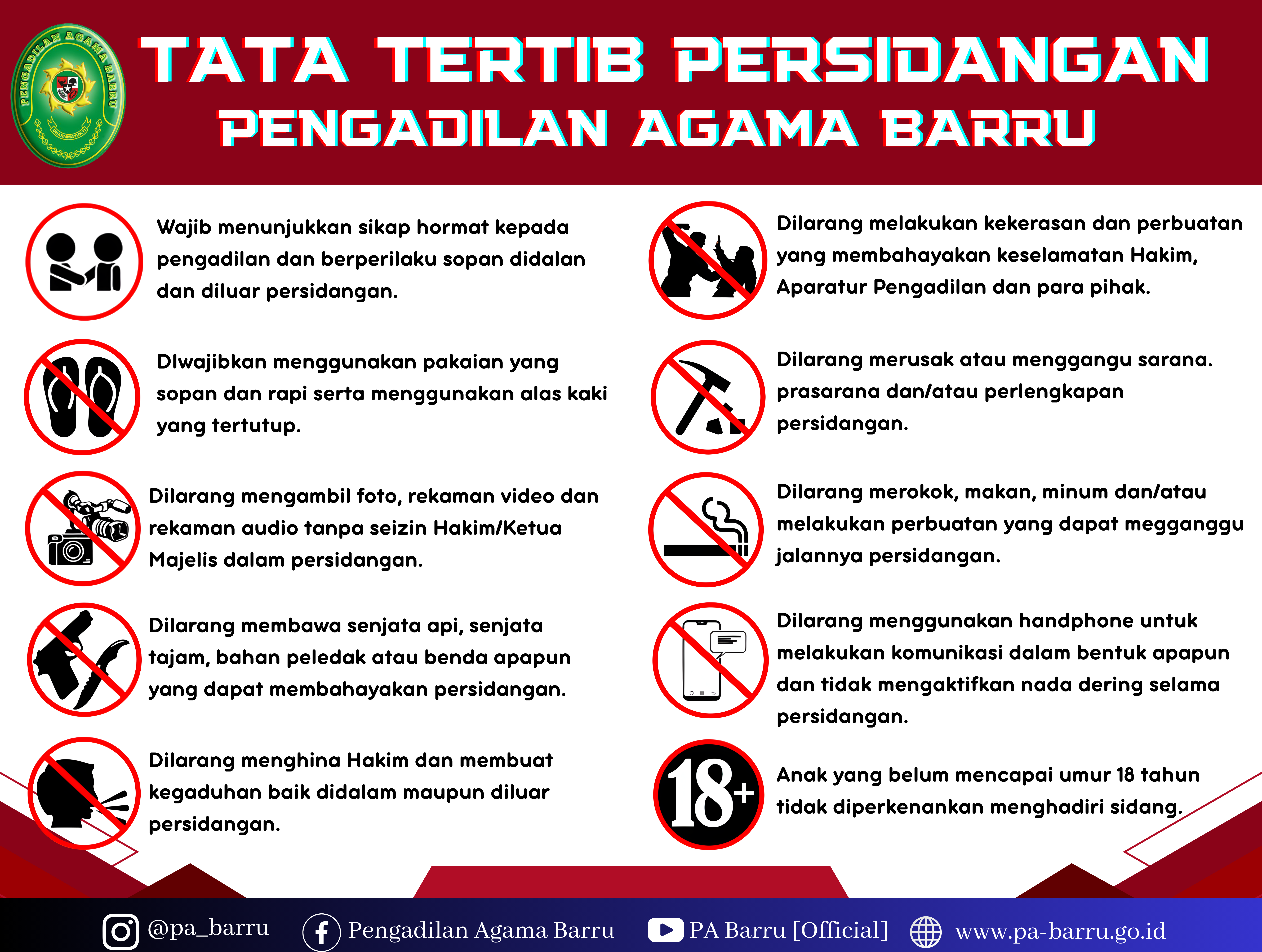 3. Pengunjung sidang dilarang makan, minum, merokok, membaca koran atau melakukan tindakan yang dapat mengganggu jalannya persidangan.